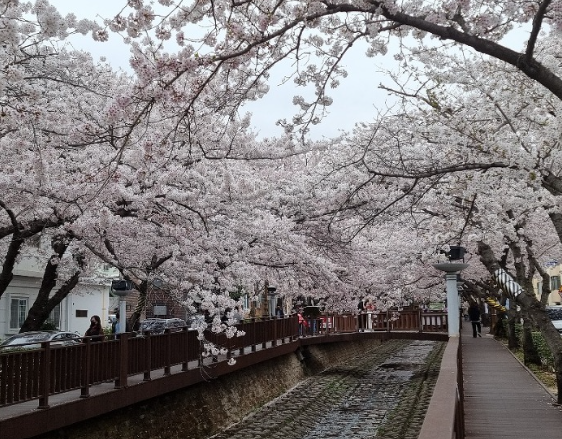 전주 한옥마을은 800여채의 한옥으로 이루어진 한국 전통 마을입니다. 벚꽃 시즌에는 마을 전체가 분홍빛 벚나무로 뒤덮인 듯한 모습이며, 한옥과 대비되어 영화같은 분위기를 연출합니다. 방문객은 마을의 좁은 골목길을 따라 거닐며 아름다운 벚꽃과 한국 전통 건축물을 감상할 수 있습니다. 많은 한옥이 박물관, 갤러리, 한식당으로 되어 있기 때문에 외국인 관광객에는 한국 전통 문화와 음식을 경험할 수 있다는 장점도 있습니다.