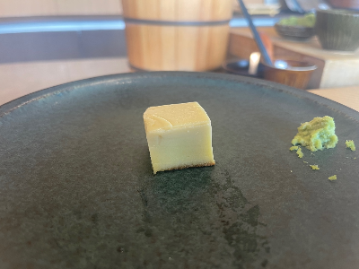 그리고 나온 요리는 복어의 이리를 가지고 만들어 주셨네요. 일본에서는 대구, 아귀, 복어 등의 이리를 가지고 요리를 해먹는다고 하네요. 밥과 복어 이리에 후추를 살짝 갈아서 올려주셨구요. 기호에 따라서는 와사비를 같이 올려드시면 맛있습니다.