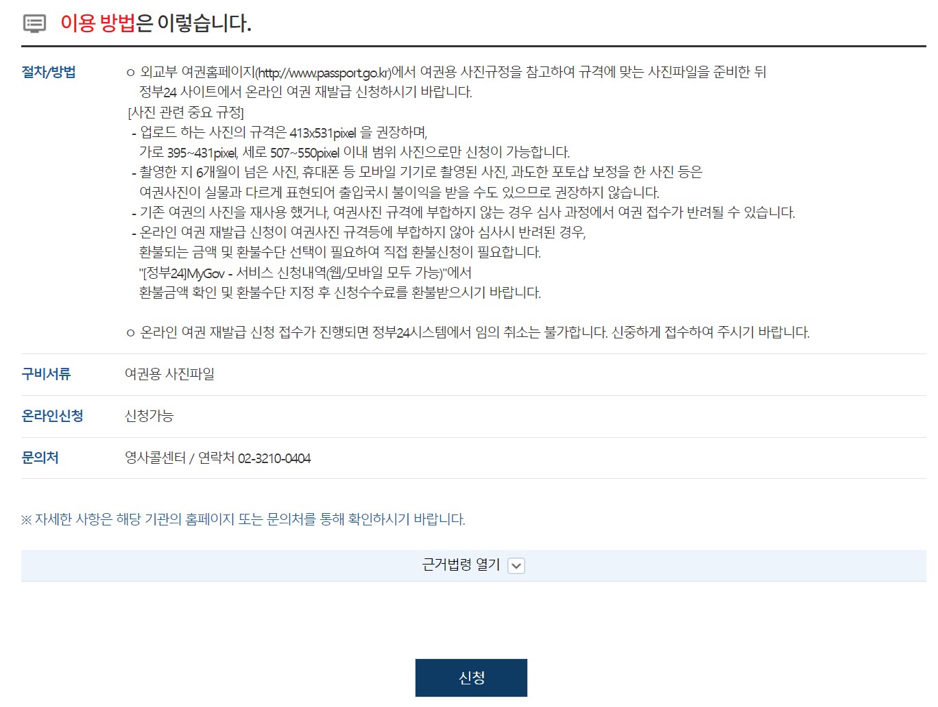 2. 온라인 여권 재발급 신청을 누르신 후 아래로 쭈~욱 내리시면 [신청] 이라는 버튼이 있는 것이 보입니다.