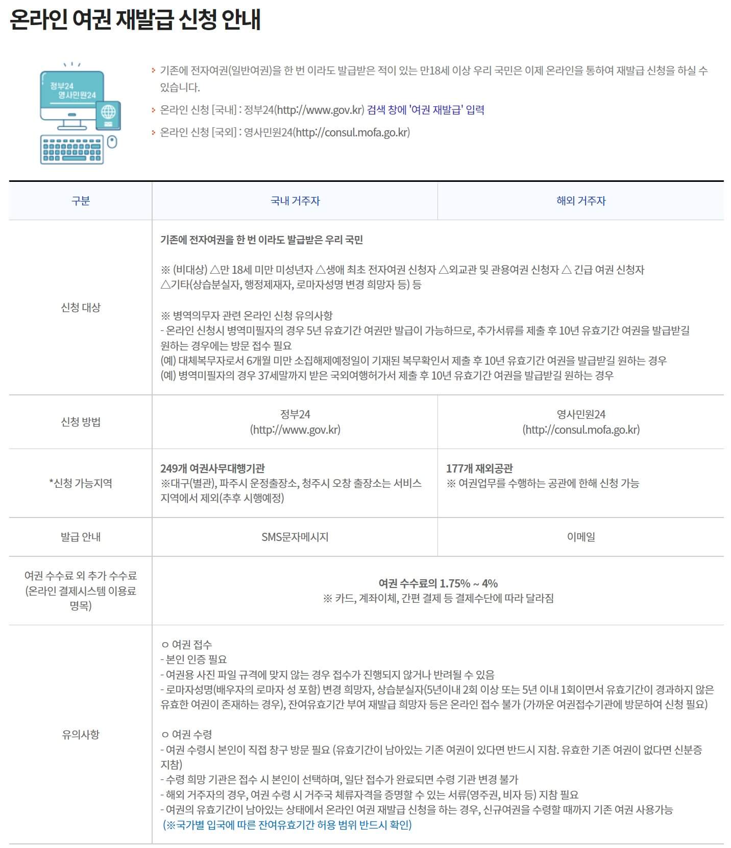 재발급 신청하시는 분들에 한해 온라인 여권 발급 신청 가능합니다.
