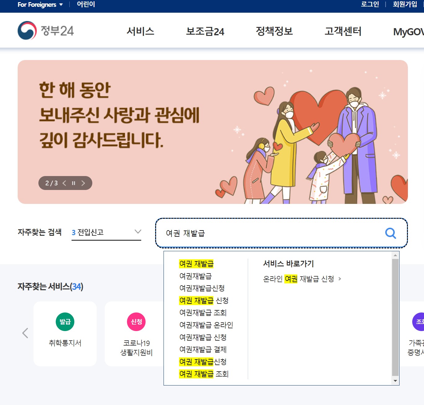 1. 정부 24 웹사이트에서 아래 그림과 같이 여권 재발급이라고 찾으시면 서비스 바로가기가 나타납니다.