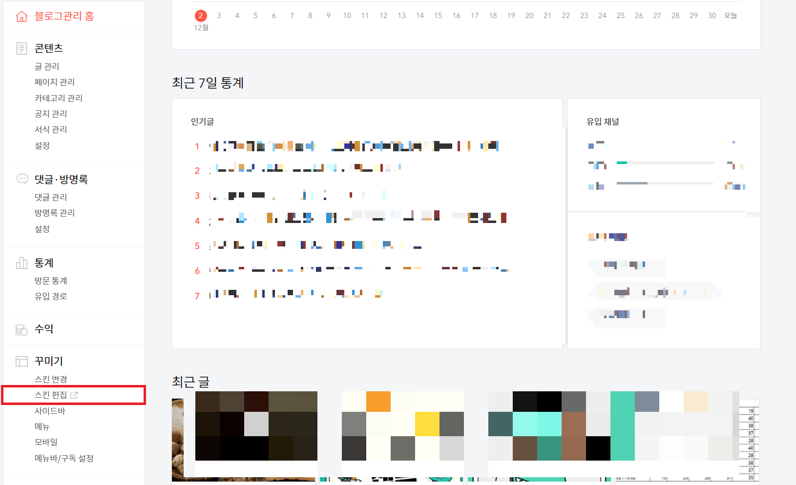 여러분들이 티스토리 블로그를 꾸미기 위해 여러번 들락날락 해왔던 바로 '거기', 스킨편집을 클릭하시면 됩니다.