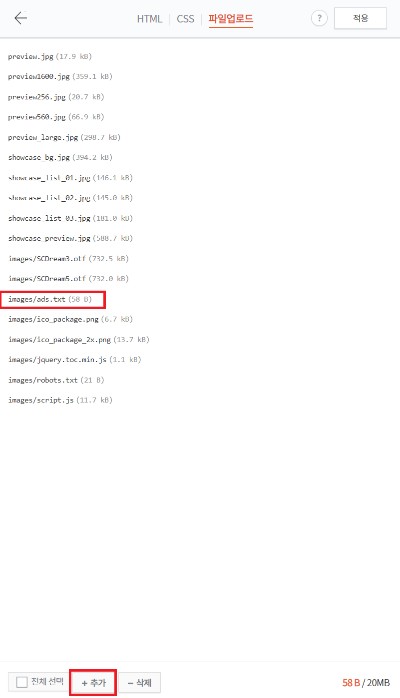 여기를 클릭하신 후 내 컴퓨터에 저장되어 있는 ads.txt 파일을 지정하셔서 확인을 누르시면 아래 사진과 같이 images/ads.txt로 등록되어 있는 것을 확인하실 수 있습니다.