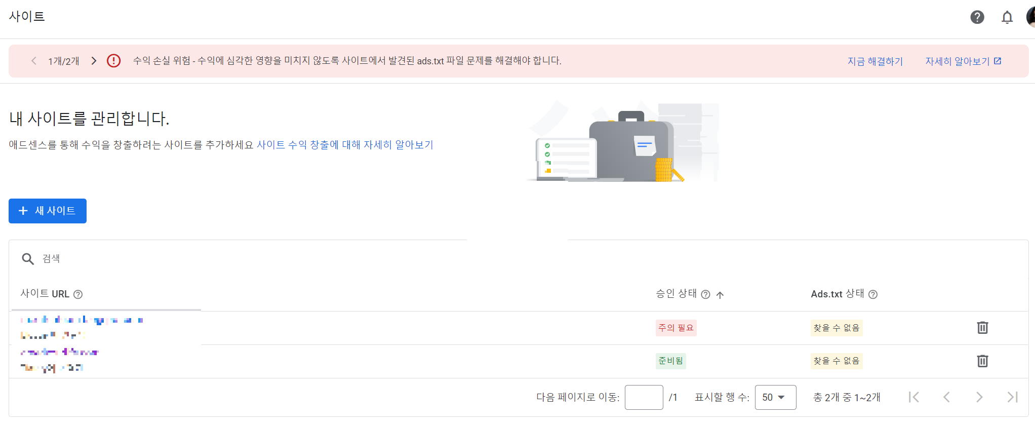 저의 애드센스 화면입니다. 수익손실위험이라는 경고문구와 함께 ads.txt. 파일 문제를 해결해야 한다고 나옵니다.