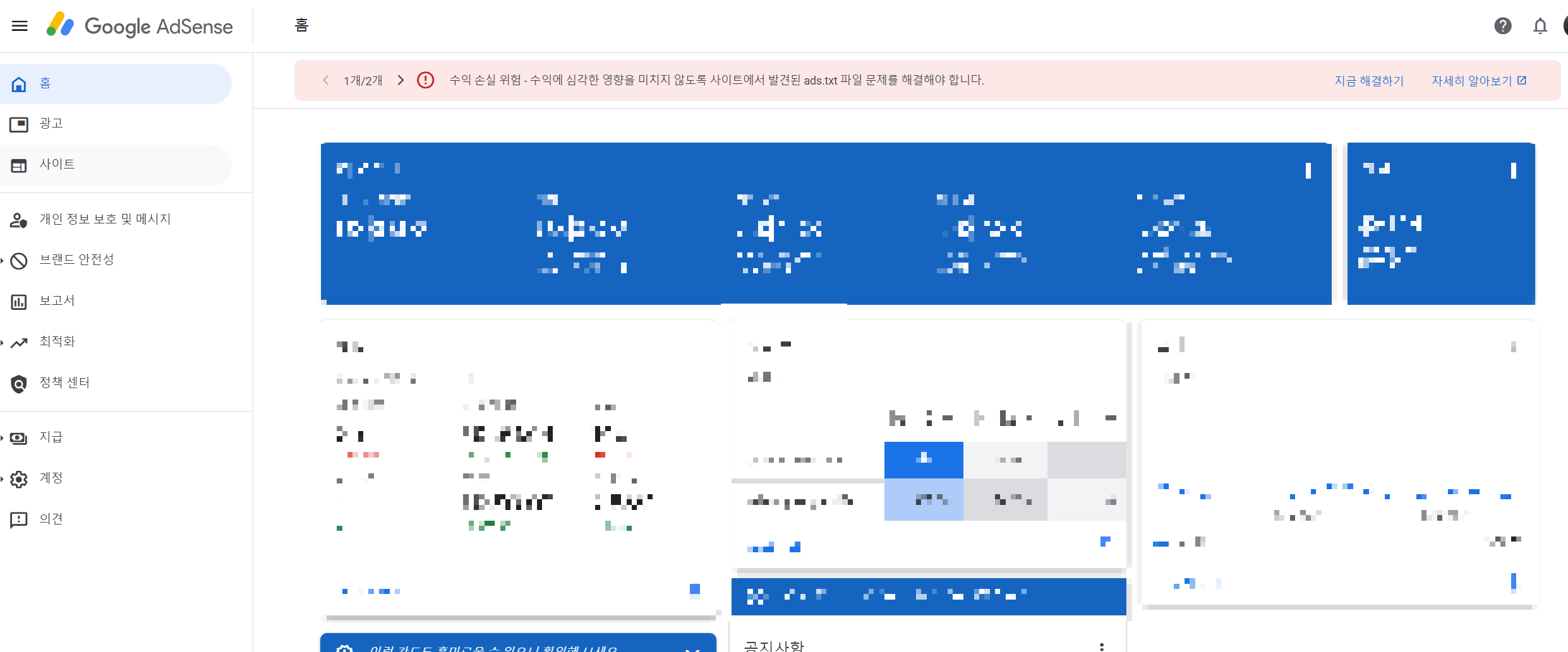 저의 애드센스 화면입니다. 수익손실위험이라는 경고문구와 함께 ads.txt. 파일 문제를 해결해야 한다고 나옵니다.