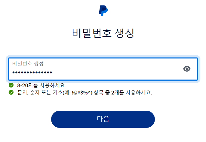 6. 그리고 이젠 비밀번호를 만들 차례에요. 아래 사진의 설명대로 8자에서 20자로 된 비밀번호를 만드셔야 합니다. 그리고 비밀번호는 문자, 숫자, 기호 중 2가지 이상을 쓰셔야 생성이 가능합니다.