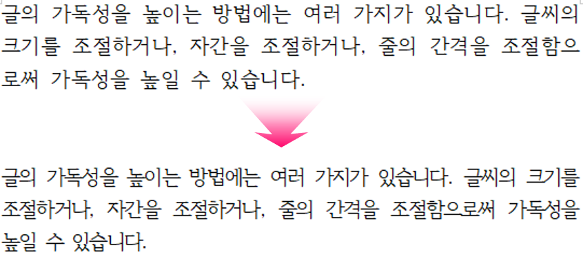 위의 문단에는 '조절함으로써'가 다른 줄에 위치하고 있기 때문에 문서를 읽다가 흐름이 끊기는 문제가 생깁니다. 그래서 자간을 살짝 줄여주고 단어들이 한 문장에서 읽힐 수 있도록 아래 문단처럼 만들어주면 가독성이 높아지겠죠?