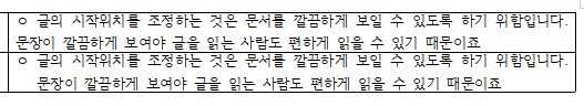 이렇게 표에서 글의 시작위치를 한 줄로 맞춰주는 것이 문서가 더 깔끔해 보이지 않나요? 콘텐츠를 더 잘 보이게 할 수 있는 문서편집방법은 반드시 알아두시면 좋습니다.