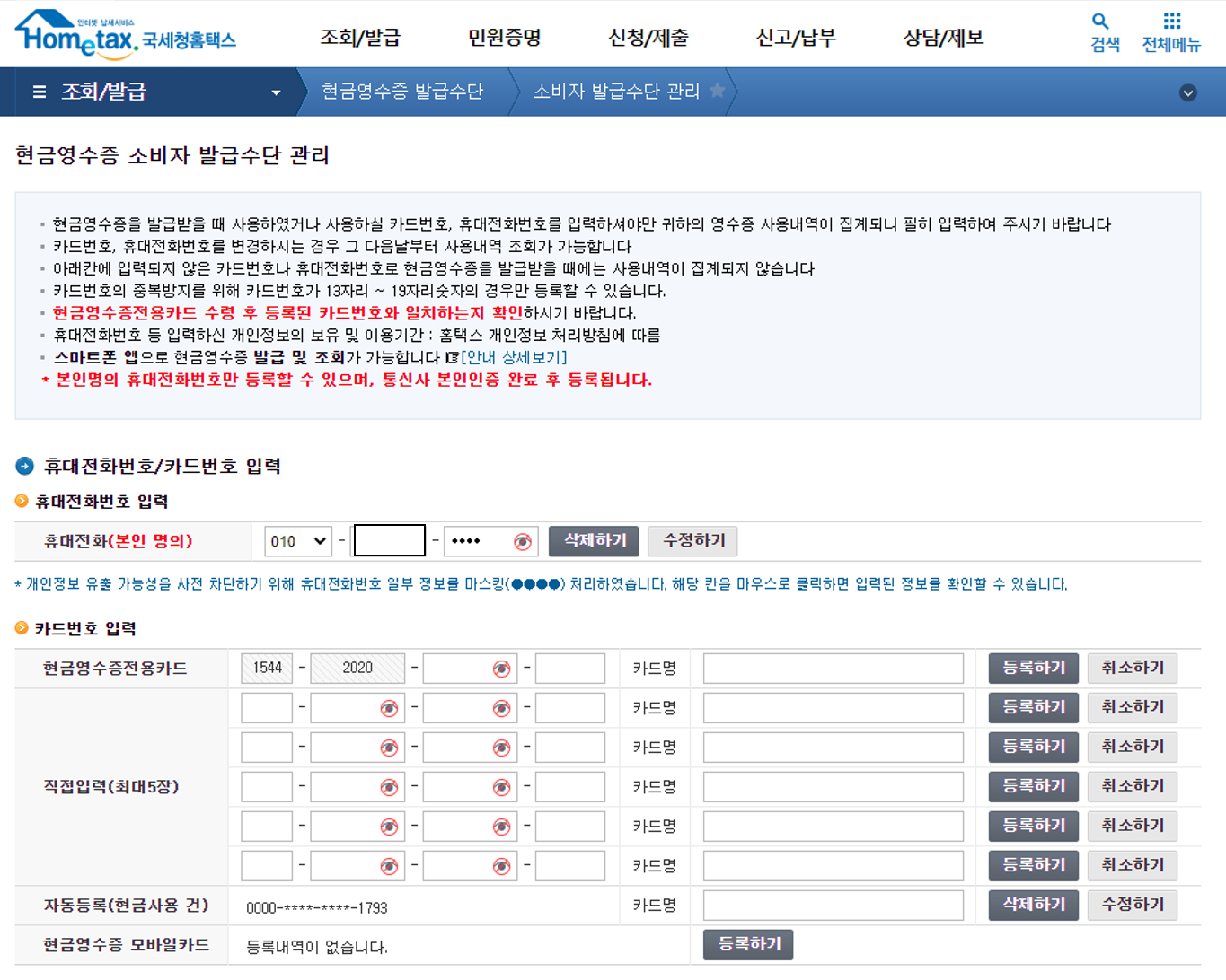 3) 소비자 발급수단 관리 선택 - 본인이 현금영수증을 발급받은 핸드폰 번호 입력하고 등록