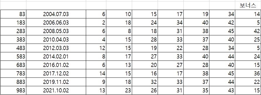 로또 시행 이후 100회귀에 대한 번호를 모두 모아봤습니다. 번호 분석은 보너스 번호를 제외한 당첨번호를 중심으로만 분석하겠습니다.