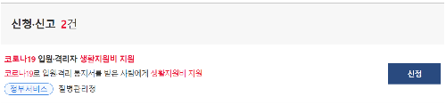 3) 검색하시면 신청,신고란에 코로나 19 입원 격리자 생활지원비 지원이라는 항목을 확인하실 수 있습니다. [신청] 을 눌러줍니다.