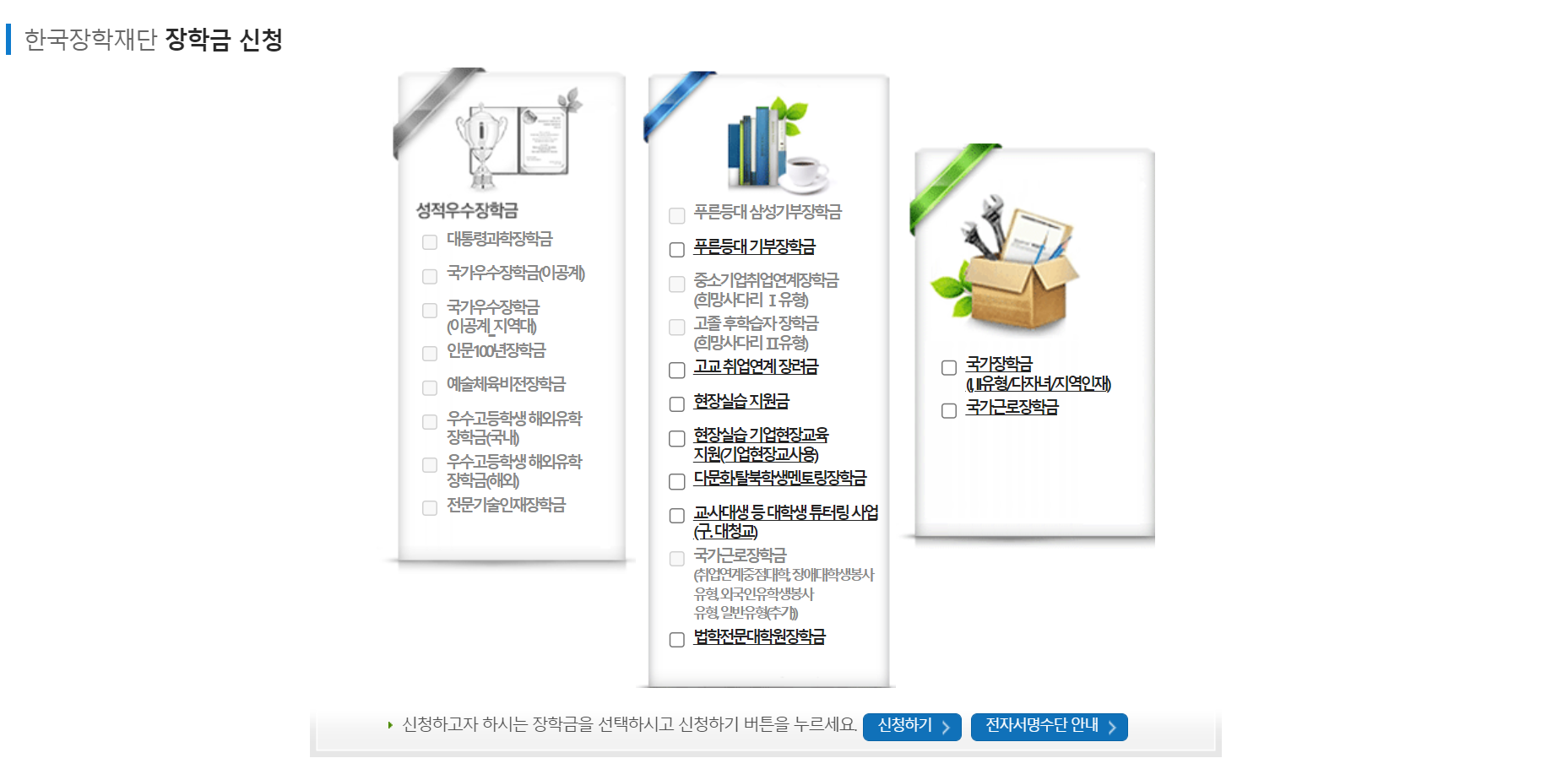 | 신청방법 | 재단 누리집(www.kosaf.go.kr)과 이동통신 응용프로그램(모바일 앱 '한국장학재단')을 통해 국가장학금 I, II 유형 및 다자녀 국가장학금 통합 신청 |