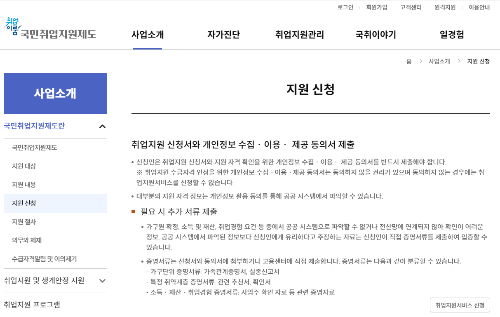 3) [지원신청]을 눌러주면, 취업지원 참여 신청 절차와 신청서 서식을 작성할 수 있는 웹페이지가 나옵니다. 해당 페이지에서 [취업지원 신청]을 눌러준 후 계속 진행해 주시면 됩니다.