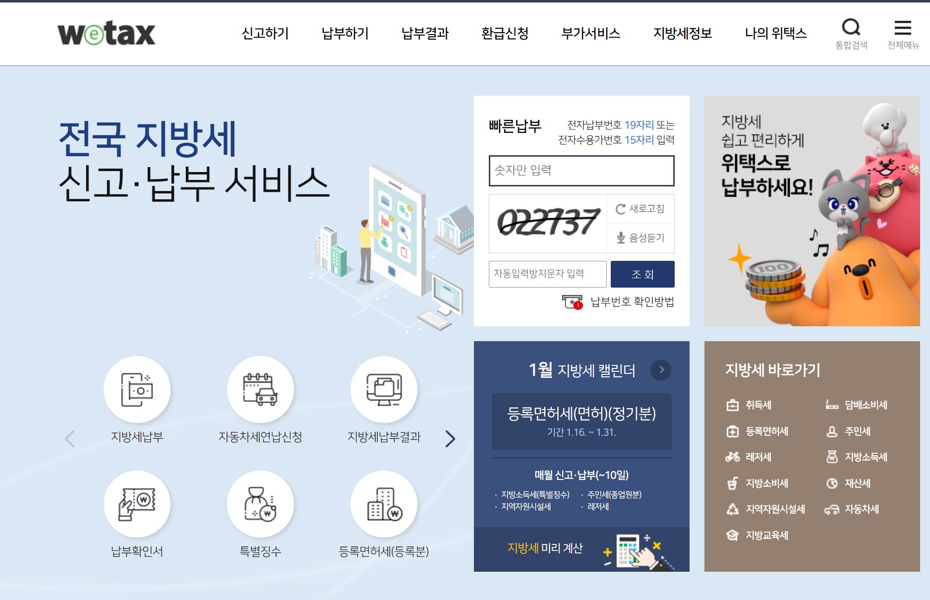 2. 홈페이지에 접속하시면 [자동차세 연납 신청] 바로가기 버튼이 보입니다.