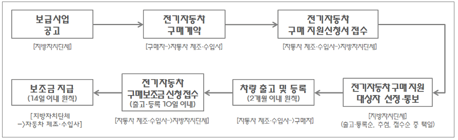 1) 지방자치단체(서울특별시, 경기도 등)는 전기차 개인부문 보급사업 공고를 합니다.