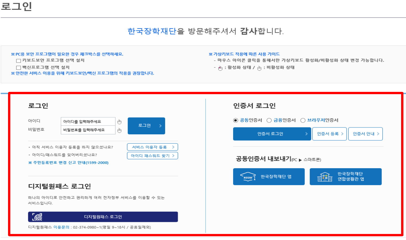 1) 먼저 한국장학재단 홈페이지(여기)에 접속한 후 로그인을 해줍니다.